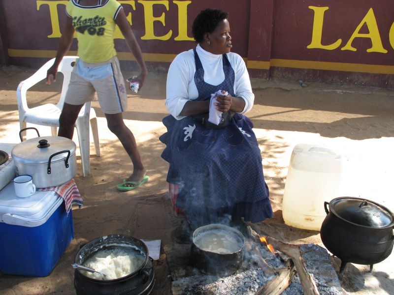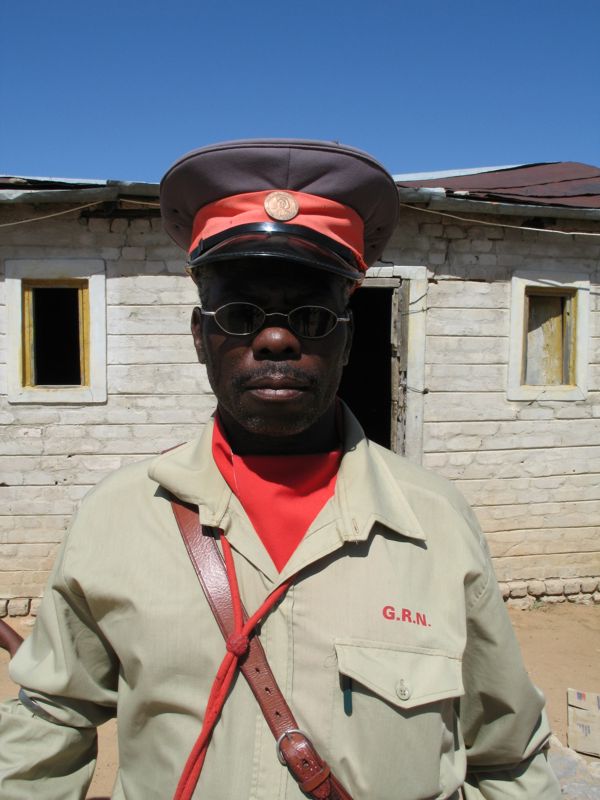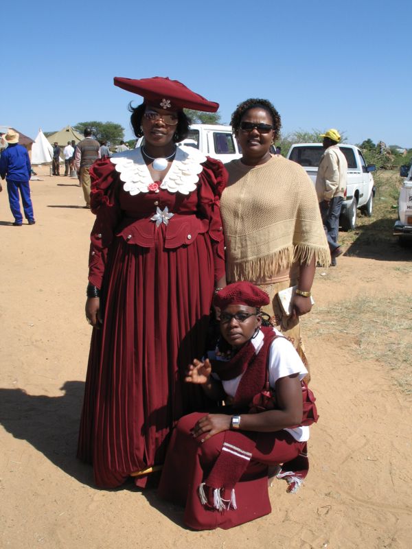 Pünktlich zur vereinbarten Zeit steht Stephanus an diesem Morgen parat. Wir fahren mit unserem eigenen Auto, das wir zuerst noch etwas aufräumen mussten damit wir zu dritt Platz haben. Zuerst heisst es einkaufen, da wir den Menschen die wir besuchen Geschenke in Form von Lebensmitteln und Süssigkeiten mitbringen wollen. In einem nahen Dorf in dem wir Einkaufen verkauft eine Frau vor dem örtlichen Pub Fleisch und Maisbrei. Wir setzen uns dazu und essen morgens um halb 10 erst mal eine Portion. Es schmeckt ausgezeichnet, auch wenn es etwas Überwindung braucht wenn man sieht wie Geschirr und Besteck nur schnell in trübem Wasser abgespült und dann dem nächsten wieder vorgesetzt werden. In diesem Dorf wohnen nur Schwarze, aber in normalen Häusern wie wir auch, und es gibt sogar eine Schule hier. Wir besuchen auch ein OpenAir-Pub, ein Ort an dem Arbeitslose und Alkoholiker herumhängen und sich besaufen. Hier wird ein eigenes Bier gebraut, das dann für einen halben Dollar (ca. 10 Rp.) pro halbem Liter verkauft wird. Ich probiere natürlich auch einen Schluck, es schmeckt ganz gut, aber eher nach saurem Apfelsaft als nach Bier... Stephanus schlägt vor noch zu der Beerdigung zu gehen die heute im Dorf stattfindet. Er meint, dies sei die beste Gelegenheit um Menschen in schönen Kleidern zu sehen. Wir sind zuerst nicht so von dieser Idee überzeugt, da wir uns als weisse Touristen an einer Beerdigung etwas fehl am Platz vorkommen. Wir lassen uns dann doch überreden und fahren in Richtung Friedhof. Die eigentliche Beerdigung ist (glücklicherweise) schon vorbei, die Leute stehen aber noch herum und schwatzen. Ich beobachte eine Reinigungszeremonie von der ich auch schon gehört habe: Man kniet nieder, spült sich den Mund mit Wasser und spuckt dieses wieder aus. Eine Beerdigung bei den Hereros ist anscheinend nicht so eine traurige Angelegenheit wie bei uns. Die Frauen haben tatsächlich ihre schönsten und farbigsten Kleider an, und Hüte die an die Hörner von Kühen erinnern. Viele Männer tragen alte Militäruniformen deutscher Soldaten. Dies ist anscheinend eine beliebte "Sonntagskleidung" für Männer. Stephanus macht mit unserem Fotoapparat viele Fotos. Er kennt die meisten Leute persönlich und diese posieren gerne für ein Foto. Weiter geht es ein paar Kilometer aus dem Dorf hinaus, zu einem Kral wo die Hereros noch (fast) so leben wie vor 100 Jahren. Ein Kral ist eine kreisförmig angeordnete Siedlung aus Lehmhütten. Im Innern des Kreises befinden sich normalerweise die Tiere. Alle Erwachsenen ausser der Grossmutter, die auf die Kinder aufpasst, sind immer noch an der Beerdigung. Macht aber nichts, wir verteilen trotzdem unsere Lebensmittel und Süssigkeiten. Obwohl die Leute hier noch ziemlich ursprünglich Leben gehen die Kinder im nahen Dorf zur Schule. Inzwischen ist es schon mitten im Nachmittag, und wir sind schon viel länger unterwegs als geplant, wofür sich Stephanus entschuldigt. Uns ist das mehr als Recht, schliesslich haben wir ja genügend bezahlt. Auf der Rückfahrt zum Waterberg haben wir noch Zeit um Stephanus etwas über das Hereroleben auszufragen. Nachdem wir Stephanus am Waterberg abgeladen haben brechen wir gleich wieder auf. Wir fahren zurück auf die B1 und dann Richtung Windhoek. Weit kommen wir an diesem Tag jedoch nicht mehr, wir übernachten auf der Farm "Hohenfels" welche von einem deutschen Ehepaar geführt wird. Zum Sonnenuntergang klettern wir etwas auf den nahen Hügel und ich geniesse noch mein letztes Bier.